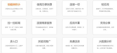 小程序是一種不需要下載安裝即可使用的應(yīng)用,它實現(xiàn)了應(yīng)用“觸手可及”的夢想,用戶掃一掃或者搜一下即可打開應(yīng)用。也體現(xiàn)了“用完即走”的理念,用戶不用關(guān)心是否安裝太多應(yīng)用的問題。應(yīng)用將無處不在,隨時可用,但又無需安裝卸載。對于開發(fā)而言,小程序開發(fā)門檻相對較低,難度不及APP,能夠滿足簡單的基礎(chǔ)應(yīng)用,hishop小程序開發(fā)認(rèn)為適合生活服務(wù)類線下商鋪以及非剛需低頻應(yīng)用的轉(zhuǎn)換。小程序能夠?qū)崿F(xiàn)消息通知、線下掃碼、公眾號關(guān)聯(lián)等七大功能。其中,通過公眾號關(guān)聯(lián),用戶可以實現(xiàn)公眾號與小程序之間相互跳轉(zhuǎn)。由于小程序不存在入口。[2]